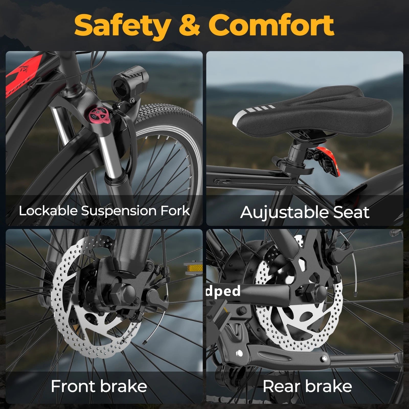 - Riding Comfortably and Handily: The 26" puncture resistant tires are for greater durability. A high-strength front fork suspension, 7-speed gears, dual lights, LCD display, front and rear mechanical disc brakes can bring your riding more comforts, make your e-bike adapted to complex terrains and keep you safe