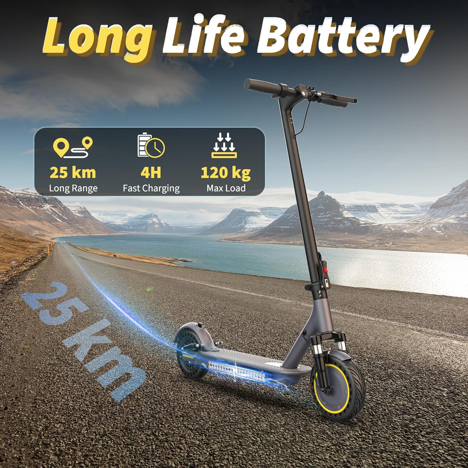 • Powerful Performance: The electric scooter is equipped with a 350W powerful motor and high-capacity battery. Under specific conditions, the speed of the electric scooter can reach 25 km per hour, and the maximum range can reach 25 km. The maximum load of the scooter is 120 kg, and it can easily handle a 15% slope.